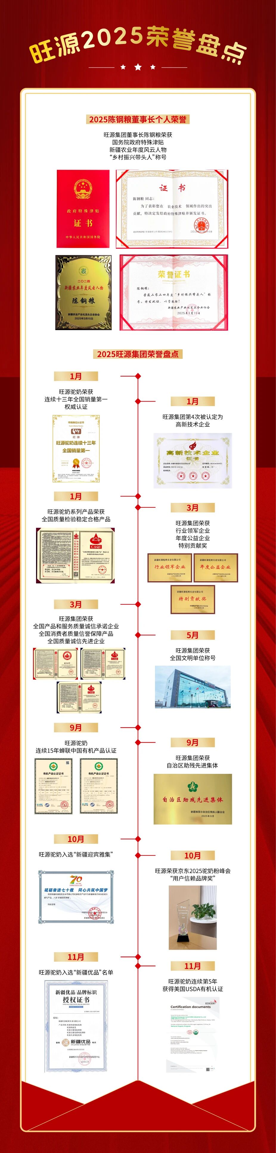 此外,集團(tuán)獲評(píng)全國(guó)文明單位這一國(guó)家級(jí)重磅榮譽(yù),在社會(huì)責(zé)任履行上,榮獲自治區(qū)助殘先進(jìn)集體稱(chēng)號(hào)。市場(chǎng)認(rèn)可方面,入選“新疆迎賓雅集”“新疆優(yōu)品”名單,榮獲京東“用戶信賴品牌獎(jiǎng)”,還連續(xù)15年蟬聯(lián)中國(guó)有機(jī)產(chǎn)品認(rèn)證、連續(xù)5年獲得美國(guó) USDA 有機(jī)認(rèn)證,國(guó)際國(guó)內(nèi)市場(chǎng)雙開(kāi)花,全方位展現(xiàn)了強(qiáng)大的品牌實(shí)力與行業(yè)影響力,印證了旺源對(duì)“五年研發(fā) 匠心堅(jiān)守 只為生產(chǎn)一杯好駝奶”的極致追求。